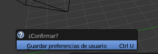 Para que este cambio tenga efecto y siga funcionando cada vez que iniciemos Blender, hay que guardar la configuración por defecto. No toques nada en la escena de la ventana 3D y lleva el puntero del ratón al interior de esta ventana. Pulsa la combinación de teclas Control+U. Aparece un menú de confirmación preguntando si guardar las preferencias de usuario. Acéptalo pulsando Enter o haciendo clic dentro del botón.