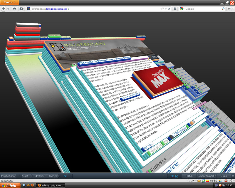 Pulsando la combinación de teclas Mayúsculas+Control+I se accede a un nuevo inspector de objetos donde se puede ver claramente en qué lugar de la jerarquía o estructura del código HTML de la página está el objeto que nosotros seleccionemos. Han añadido una opción para moverse por la página en una vista 3D donde los distintos objetos se van apilando. Se puede comprobar como las páginas que han sido hechas "artesanalmente" escribiendo directamente el código tienen una estructura más plana, mientras que las que dependen de programas de autoría (Dreamweaver, Frontpage...) o hacen uso de plataformas complejas como este blog alojado en blogger, llegan a tener una estructura 3D con forma de verdaderas torres de elementos anidados.