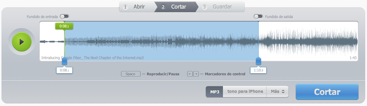 El primer paso será seleccionar el archivo mp3 de nuestro ordenador. Enpezará la subida y ya aparecerá este panel de operaciones con el que podremos empezar a trabajar incluso antes de que termine de subirse el archivo. Sólamente hay que arrastrar a izquierda y derecha los cursores de inicio y fin para seleccionar el trozo de música que queremos. Conforme hacemos esto se irá escuchando un fragmento del archivo para que sepamos exáctamente por donde vamos. Se hace bastante intuitivo. Se puede aplicar un fundido al principio y final para que no se note el corte brusco, seleccionar el formato de salida y descargar nuestro archivo recortado. Así de sencillo.