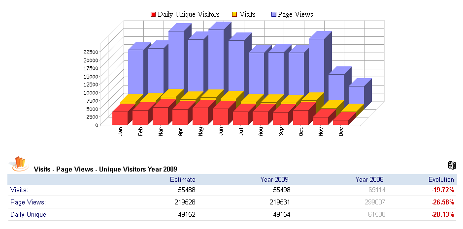 Otras páginas similares no alcanzaban este nivel de visitas ni siquiera tras gastar dinero en publicidad Adsense y tenían cierta envidia y nos interrogaban a ver cual era la técnica SEO extraña, a ver las palabras claves, los "meta" o los sitemaps que estábamos usando. Nunca tomamos en serio el tema del posicionamiento y la clave parece que estuvo en ofrecer contenido relevante. Salíamos los primeros en google para determinadas búsquedas de términos de programación y recibíamos bastantes visitas de foros especializados. Fue bonito mientras duró. Tras varios años con un horario de trabajo insufrible fuimos dejando un poco de lado la actualización de los contenidos de la web, y ahora el material referido a la programación ya parece del año de María Castaña, y las visitas han descendido sustancialmente.