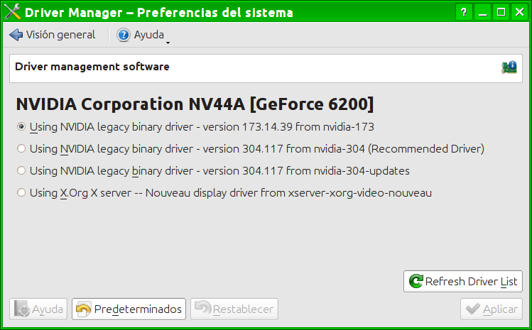 Ante su insistencia, le haremos caso. Aparece el Driver Mánager y allí se nos recomienda que instalemos el controlador en su versión 304 (Recommended Driver). Le haremos caso también, como no. Se nos pide reiniciar el equipo, y entonces nos encontramos con la pantalla en negro. No hay entorno gráfico y aparentemente no funciona nada. Comprobamos que Linux no está bloqueado porque las luces del teclado sí se pueden encender y apagar, y se nos ocurre entrar a una consola virtual pulsando Control+Alt+F1. Los recién llegados a Linux no tenemos por qué saber esto, menos mal que un día lo leí por ahí.