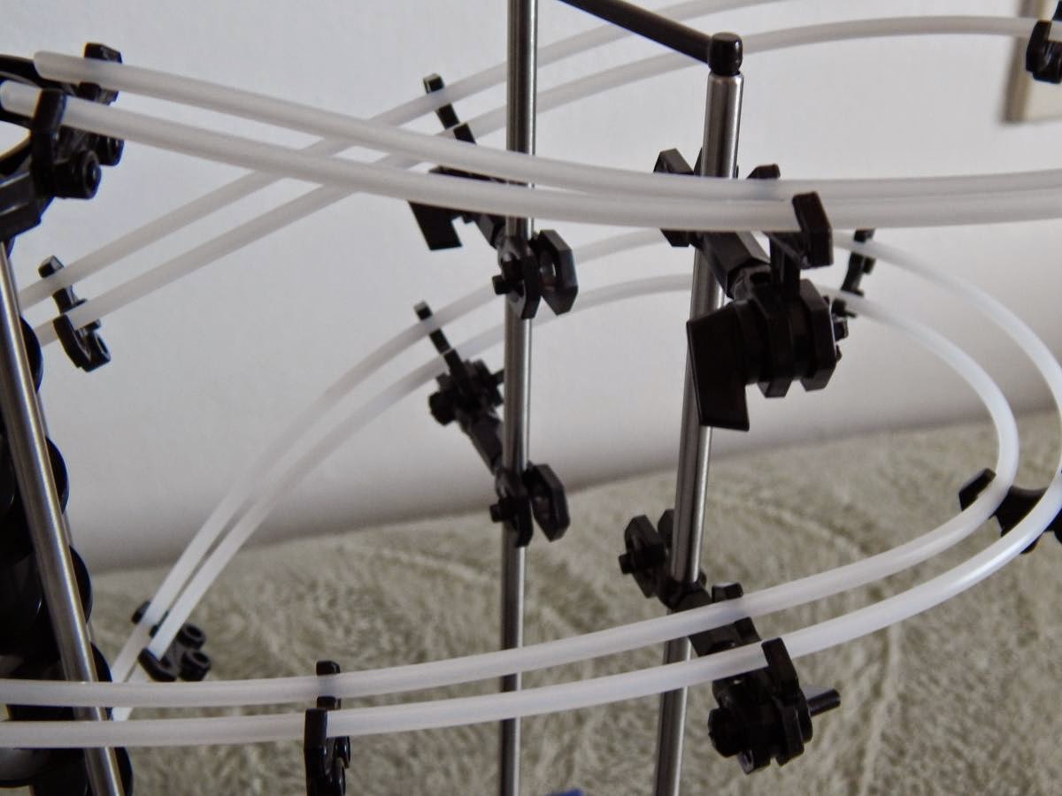 Por último habrá que ajustar los raíles para que la bola no se caiga y llegue hasta el final. Las pinzas son articuladas y permiten mucho movimiento, después se aprietan con una llave para que se queden fijas. Este es un proceso realmente entretenido donde con paciencia habrá que ir ajustando las pendientes, las curvas, los peraltes y la separación entre raíles usando traviesas adicionales. Empezaremos desde lo alto y veremos como poco a poco la bola va rodando cada vez mejor por el circuito sin caerse hasta llegar abajo a la base del elevador. Habrá que repetir la tarea para cada tramo y ocasionalmente reajustar los anteriores en lugares donde se estorben.