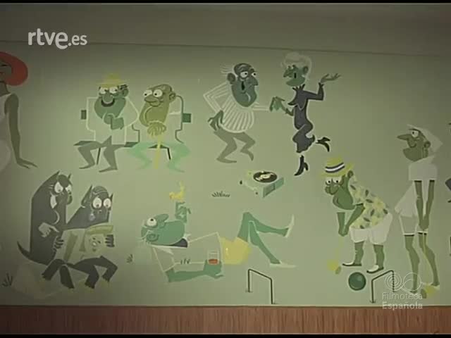 Y los hogares del jubilado. Parece que en esa época la administración pública no ofrecía estos servicios y tenían que ser las Cajas las que los montaran. Llama la atención viendo estas imágenes que un "hogar del jubilado" sea una sala abarrotada de hombres mayores -mujeres no- muy bien trajeados sentados en sofás de escay muy juntos y fumando sin parar. Curiosos los murales de las paredes. Se pondrían ahumados muy pronto. Parece ser que eso es lo que se llevaba entonces.